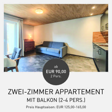 - Alle Appartement-Preise gelten pro Übernachtung für die Belegung mit zwei Personen inklusive Endreinigung.